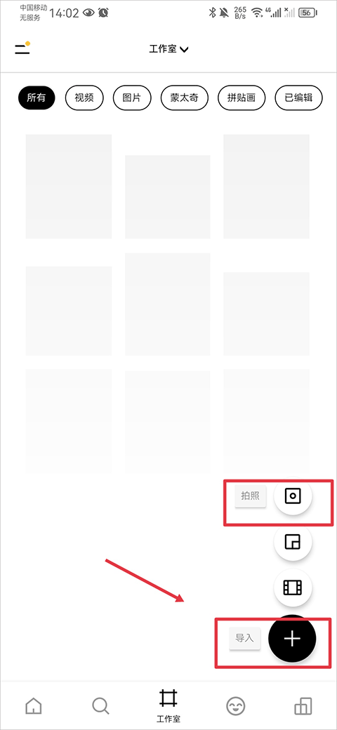 1、在app中的工作室界面,先点击右下角+号导入一张照片