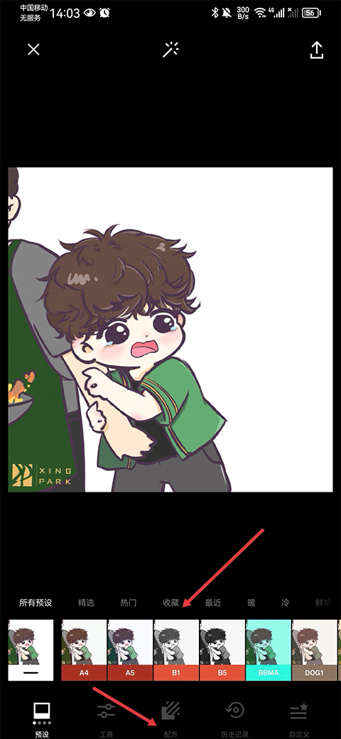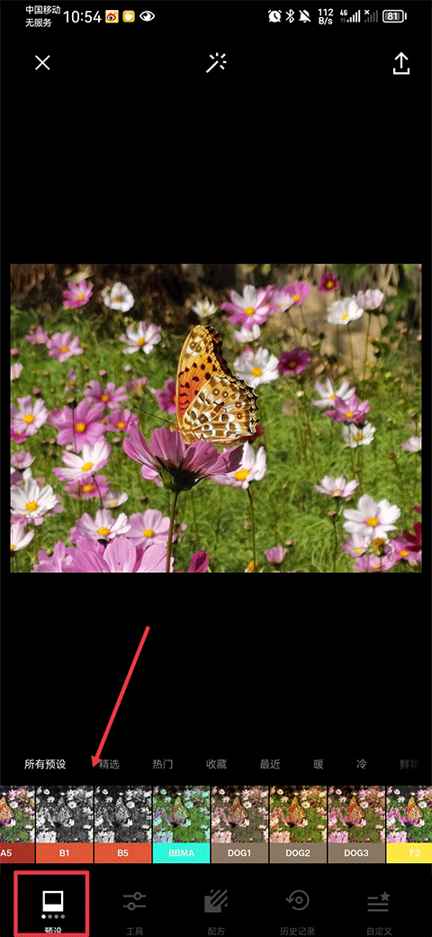 3、在编辑界面中你就可以根据自己的喜好去添加滤镜啦,将照片编辑好后,点击配方功能