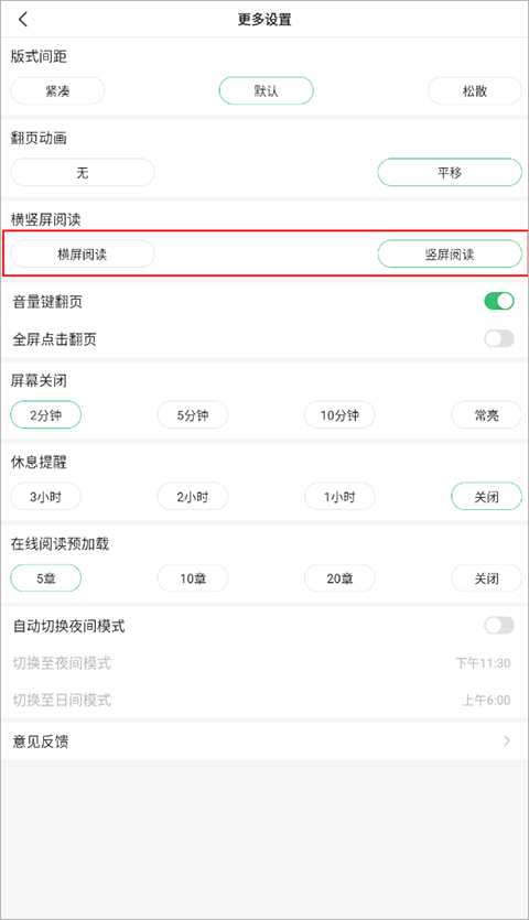 2、进入更多设置页面,在横竖屏阅读一栏选择“横屏阅读”就可以啦。