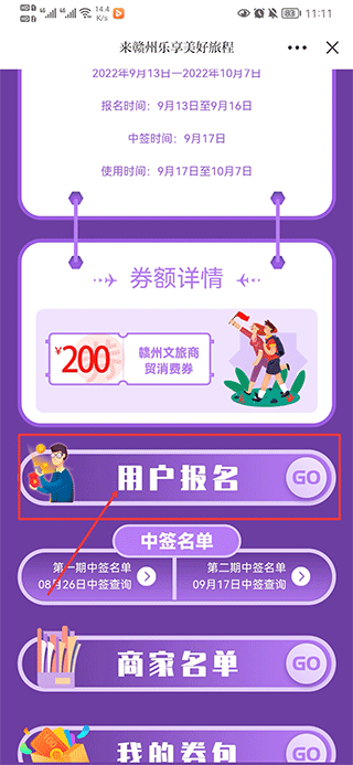 2、进入后,页面下滑至点击用户报名,报名完成后等待中签即可