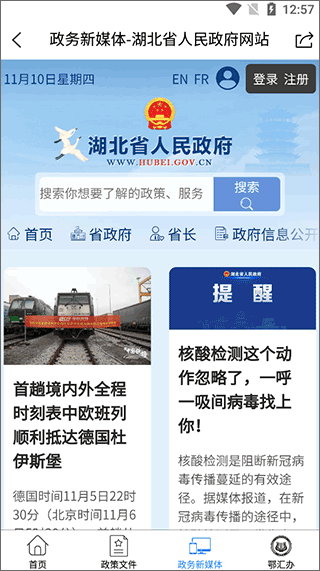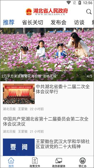 1、打开湖北省政府app,在软件的首页便向大家展示了省内的各种重要政策信息;