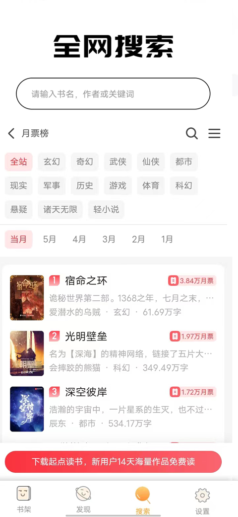 4、之后进入搜索界面,这个app里面可进行全网搜索小说。