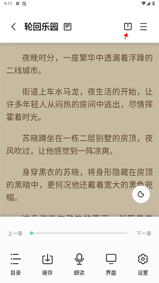 3、进入阅读页面后,然后点击箭头标记的图标