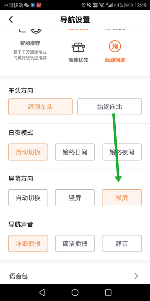 5、用户可以进一步单击【导航设置】,进行更为详细的设置,例如车头方向、屏幕方向、导航声音等。