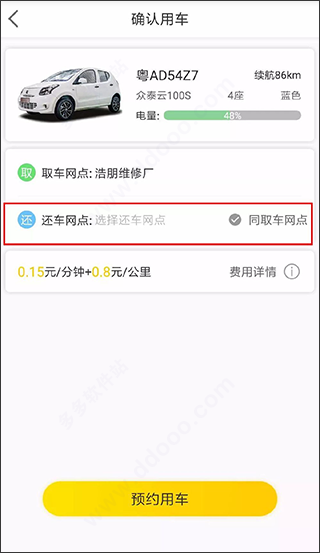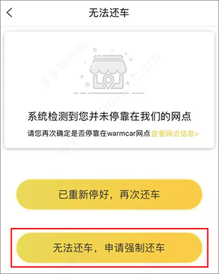 1、请查看warmcar共享汽车app上订单所选,还车网点(可更换)