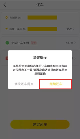 5、若您手机、车辆定位与预定网点不相同,导致无法正常还车,点击继续还车