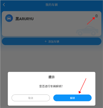 2、进入车辆界面后,点击右上角的垃圾桶图标,再点击解绑即可啦。