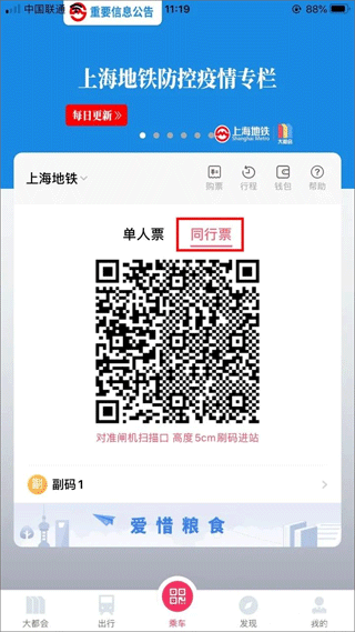 1、 进入乘车页,将二维码切换由“单人票”切换为“同行票” 。