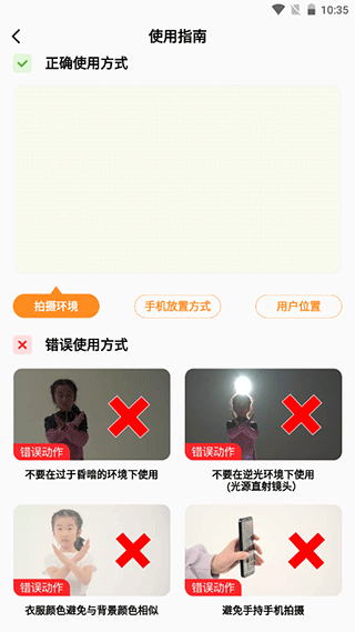 用软件拍摄视频时,不要在过于昏暗的环境下使用,不要在逆光环境下使用(光源直射镜头),衣服颜色避免与背景颜色相似或相近,且避免手持手机拍摄。
