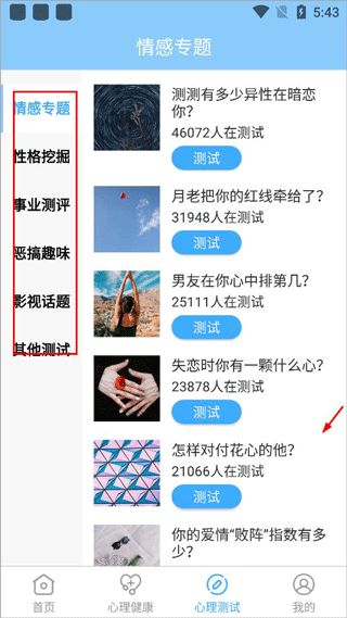 3、心理测试页面,有针对性地分类测试,包括情感、性格、事业、影视等;