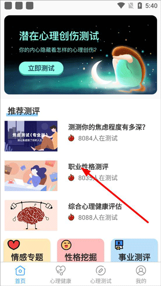 1、打开app,首页可以进行多项测试(职业、性格、情感等);