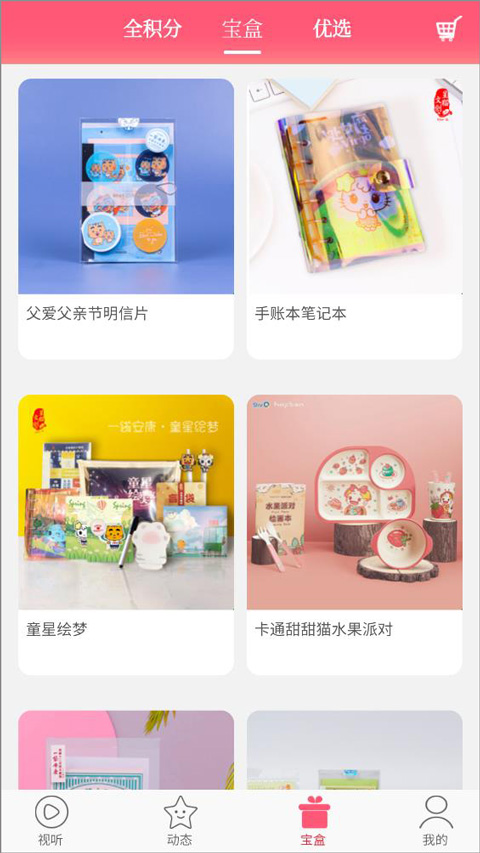 1、用户登录打开星猫乐园app,打开宝盒页面,宝盒有全积分兑换、宝盒、优选以及购物车等,用户可选择不同栏目换购商品;