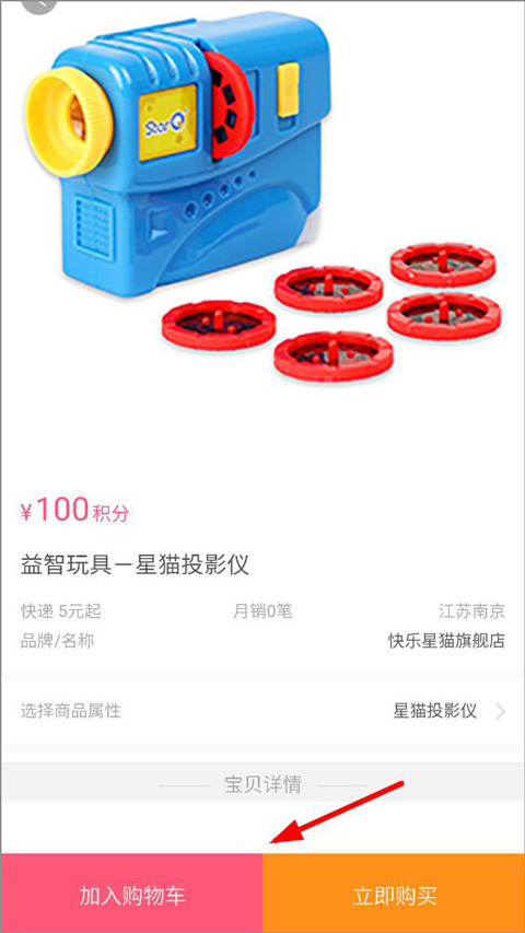 2、打开换购物品页面,用户可查看商品换购需要的积分、发货地、品牌名称、商品属性以及详情等,点击加入购物车或立即购买;