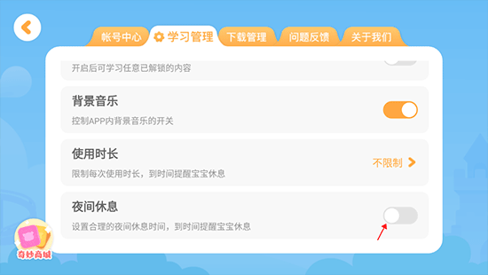 3、点击“学习管理”,滑到最下方,点击右侧的开关,即可开启夜间休息时间。