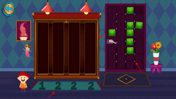 5、点击第三个模块,左边是一个柜子,右边是一道门,根据柜子下方的数字来将门上面的宝石放到对应的柜子里面,只有放正确了才可以通关。