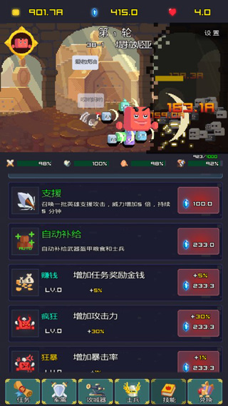 1、采用非常具有特色的像素风格,各种Q萌可爱的糖豆角色登场,帮助玩家战斗;2、丰富的糖豆养成玩法,收集各种宝石强化糖豆的技能和属性,还可以转生获得大量属性提升;