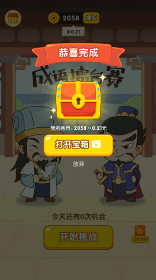游戏里有升级系统,难度逐渐增加,从一个小乞丐一步步升到丞相,很有成就感。还有擂台赛可以挑战,赢了还能开宝箱拿奖励。整体操作简单,点点就能玩,适合想动脑筋又不想太费劲的人。背景音乐也轻松愉快,让人觉得放松。