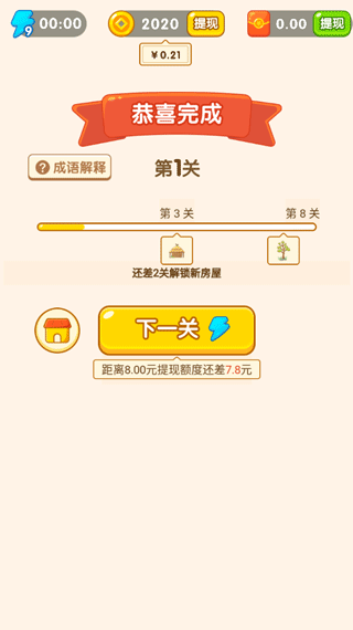 3、每次通关后都会有金币的奖励,还可以看见房屋升级的条件