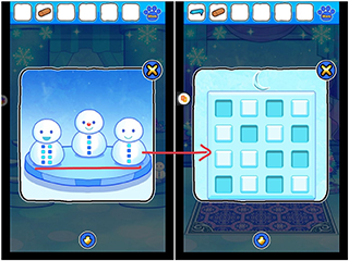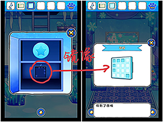 镜子处 置物架上三个雪人→黄金框、木塞、记住雪人身上方块排布提示