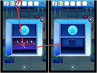 二层 保险柜处 保险柜下方小星星+铁棒+点击→凹槽+方块提示