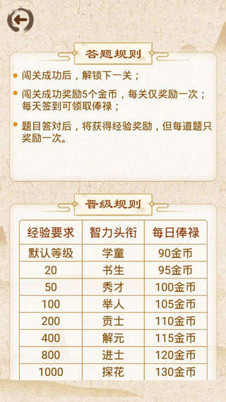 - 闯关成功奖励5个金币,每关仅奖励一次,每天签到可领取俸禄。