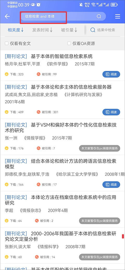 万方数据app主要为学术资讯所开发,其中整合中外文期刊、学位论文、会议文献、科技报告、专利文献、视频等十余种资源类型,内容涉及自然科学和社会科学各个专业领域,是国内最大的学术文献全文数据库之一。同时该软件还支持多种资源的统一检索,不仅可对检索结果进行排序和筛选,直接在手机端阅读文献。还可以通过对搜索类型的选择,以及选择搜文献(包括期刊论文、学位论文、专利、会议论文、科技成果、标准与法规)或搜期刊等等,能够帮助用户精准发现、获取与沉淀学术精华。