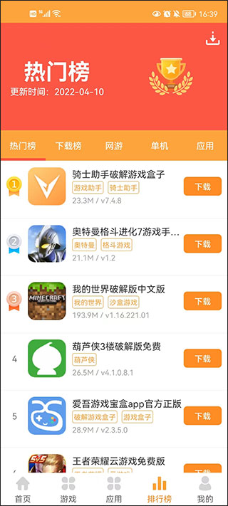 排行榜主要分为人气、最新、飙升、下载和期待榜,可以轻松找到近期热门游戏,或者预约即将上线的新游戏。