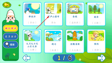 4、选择想学的唐诗,点击打开,可以跟读学习,下方箭头可切换唐诗学习;