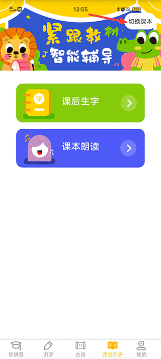1、打开软件注册登录后,在“课堂同步”界面,点击界面右上角的“切换课本”。