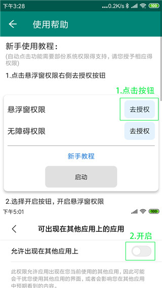 1、打开自动点击神器,根据app的操作引导,开启各种使用权限