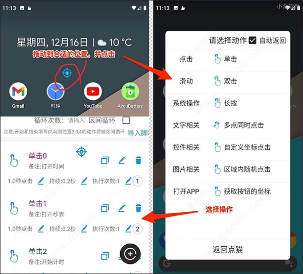2、手动录制自动化其中点猫免root自动点击器中有两种录制方式:手动和自动。手动录制需要先拖动下图那个目标去合适的位置,然后点击该目标,选择动作,不断重复这个过程,直到整个步骤完成: