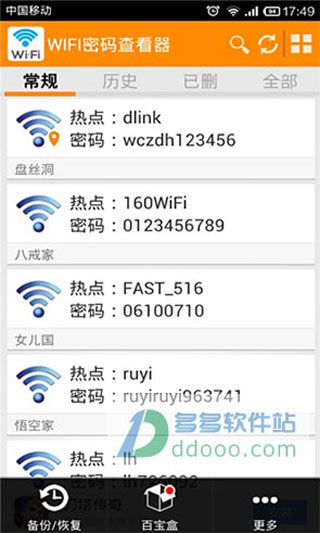 手机如何查看wifi密码?对于这个问题,小编在这里推荐大家使用wifi密码查看器安卓版,它是一款运行在android平台上的手机wifi密码查看软件,全中文版操作界面,完全免费,能够查看当前设备曾经连接过的所有wifi名称和密码,可以帮助用户找回遗忘的WIFI密码,但并非破解WIFI密码,如果想破解他人的wifi密码,用户可以试试wifi万能钥匙,应该不会让你失望的。另外本款wifi密码查看器操作简单,支持备份和恢复功能、支持复制热点和密码、但软件需要root才能使用。