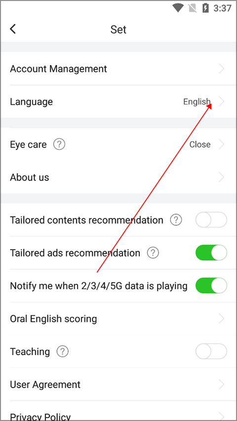 1、下载安装好英语趣配音国际版,点击me“我的”,再点击settings“设置”。