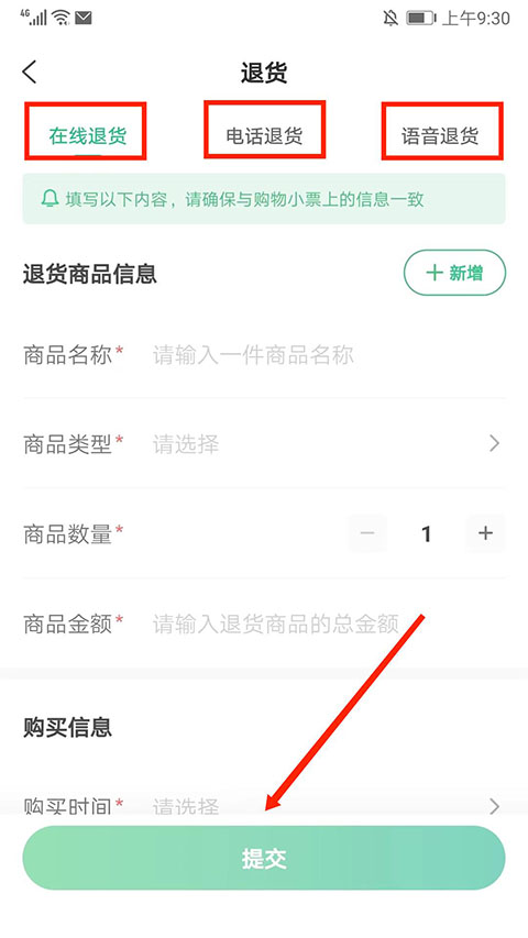 3、进入到退货界面,支持“在线退货”、“电话退货”和“语音退货”等功能,这以“在线退货”为例,填写好相关信息后,选择下方“提交”即可退货。
