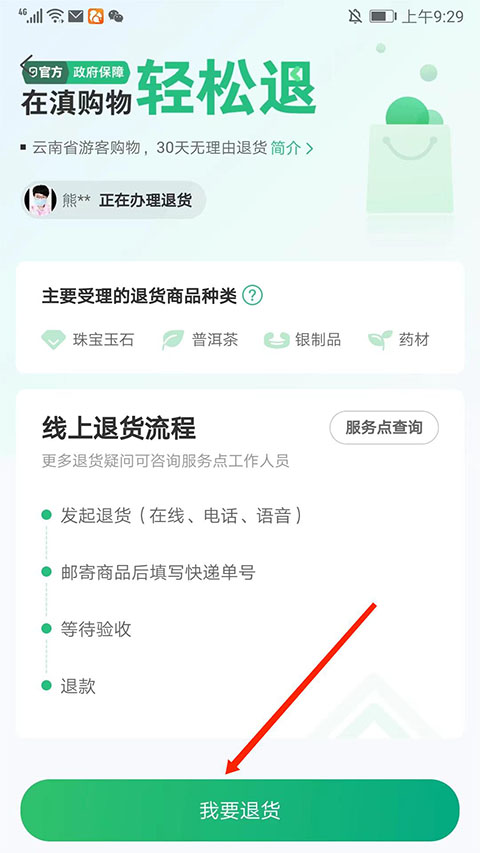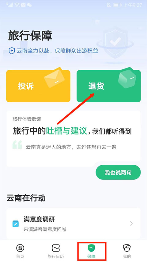 1、打开游云南app,点击下方“保障”界面,然后选择“退货”选项,