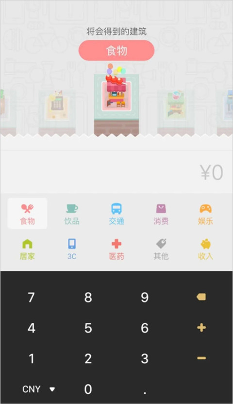 1、在本站免费下载记账城市官方正版,就可以打开软件啦,点击进入开始记账,这里有许多的支出条目,有效避免了你记录支出来由的麻烦,只需要简单分个类就可以了,这对于每一种可能的支出,比如食物、饮品、交通等等都有着与之对应的建筑。