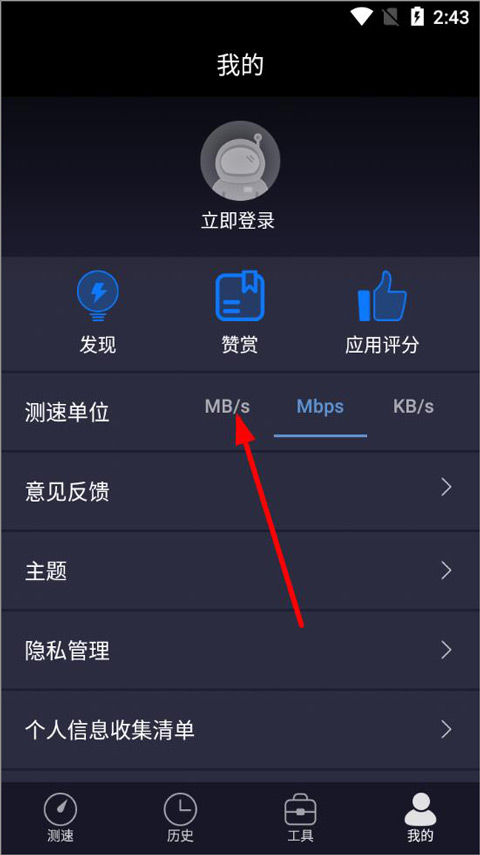 1、打开手机测网速软件进入我的页面,有发现、赞赏、应用评分、意见反馈、主题等功能栏,点击选择测速单位;
