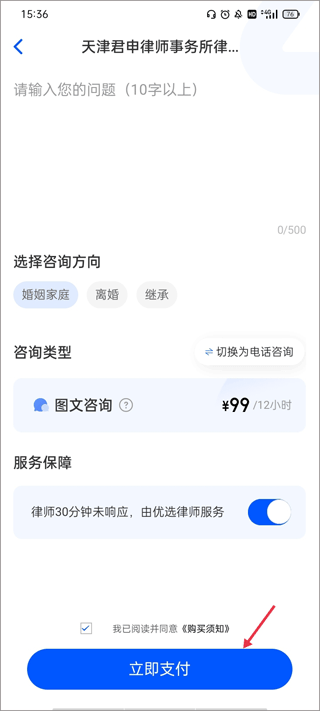 3、具体描述你像询问的法律问题,选择咨询方向和咨询类型,勾选“购买须知”之后并点击立即支付就可以了,之后会有专业的律师为你解答相关问题。