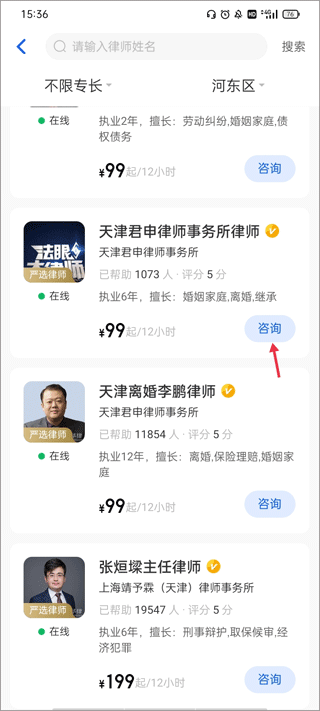 2、在搜索框中找到自己信赖的律师,并点击“咨询”。