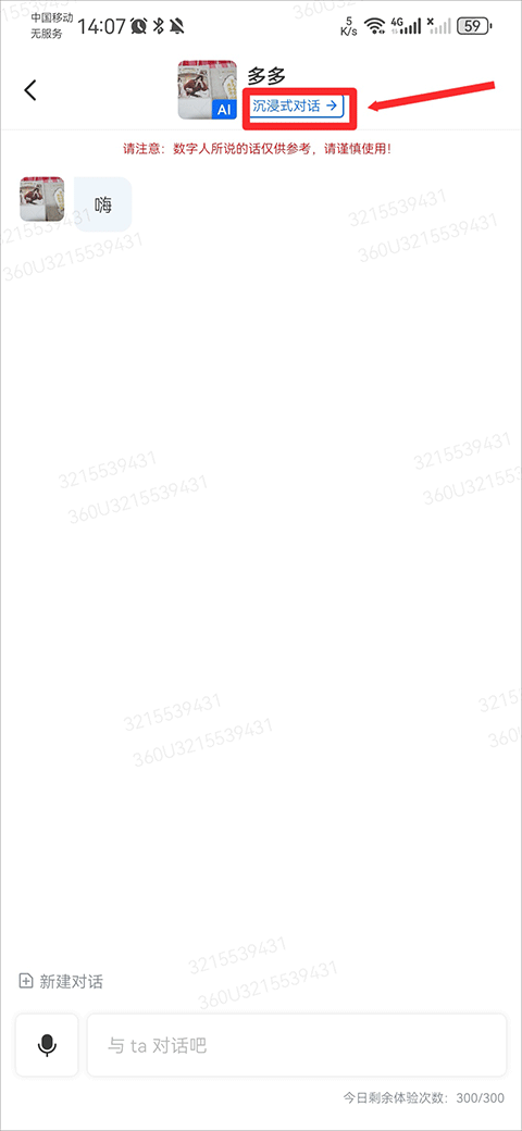 1、根据上方教程步骤打开与数字人对话的界面,然后点击上面的沉浸式对话