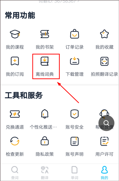 2、进入【个人中心】页面,点击页面内的【离线词典】功能