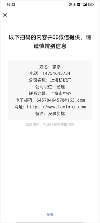 4、用微信扫描二维码之后就会看到里面的内容都是一样的,这就表示名片二维码制作成功。