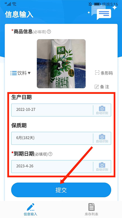7、继续将保质期进行拍照,识别成功后,即可出行详细的【保质期】以及【到期日期】信息,最后选择【提交】选项即可成功保存,