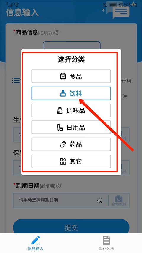 2、在【选择分类】窗口中,包括食品、饮料、调味品、日用品、药品和其他类型,用户可根据需求选择即可,这里以【饮料】为例,