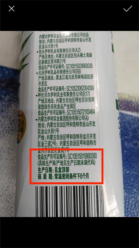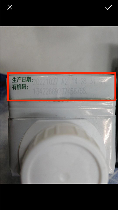 6、如图,对准商品生产日期进行拍照,识别成功后,即可出现详细的【生产日期】,