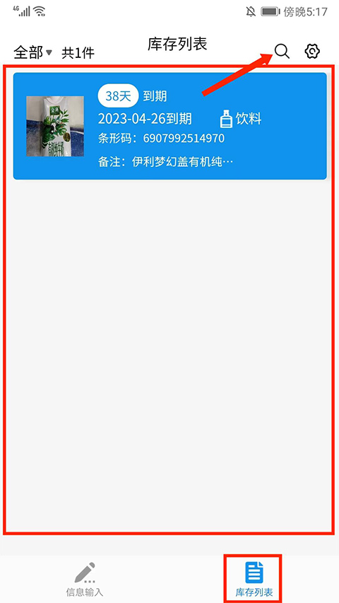 8、进入【库存列表】界面,可看到所有保存的商品信息,选择右上角【放大镜】图标可以进行商品搜索,点击需要查看的商品,