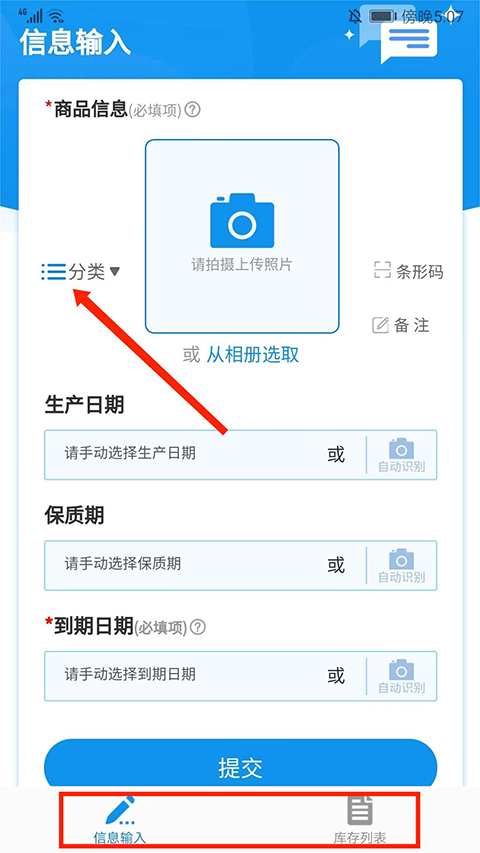 5、接下来进行【生产日期】、【保质期】和【到期日期】的填写,可以手动选择也可以拍照自动识别,这里以【拍照自动识别】为例,