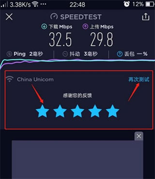 4、可以按界面提示做评价反馈,根据需要也可以点击“再次测试”。