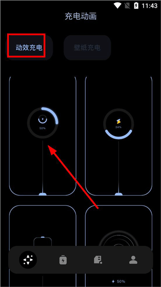 1、打开小橘充电app,首页可以设置充电动态效果和壁纸,点击其中一个动效充电;