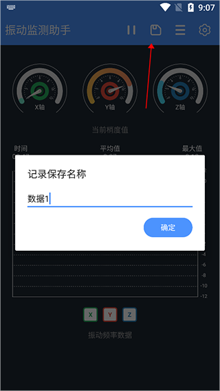 点击下图红色箭头所指的保存按钮就可以保存当前震动数据
